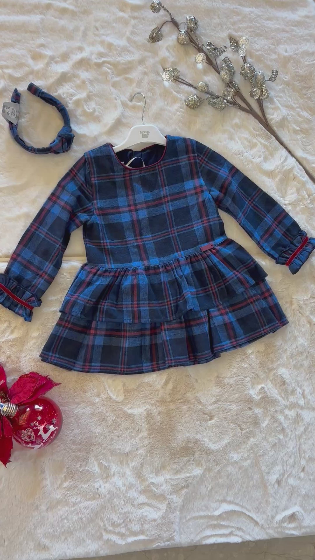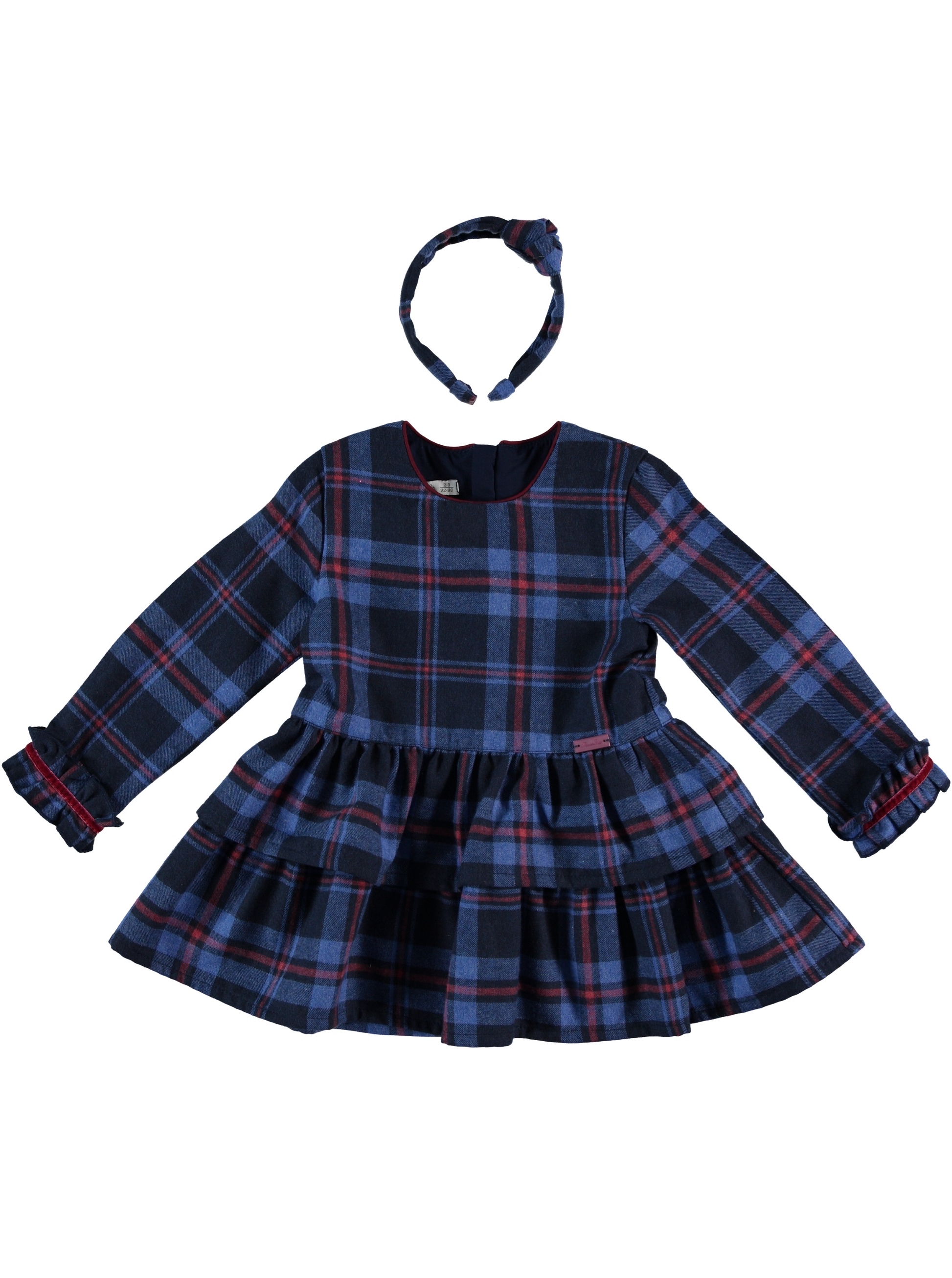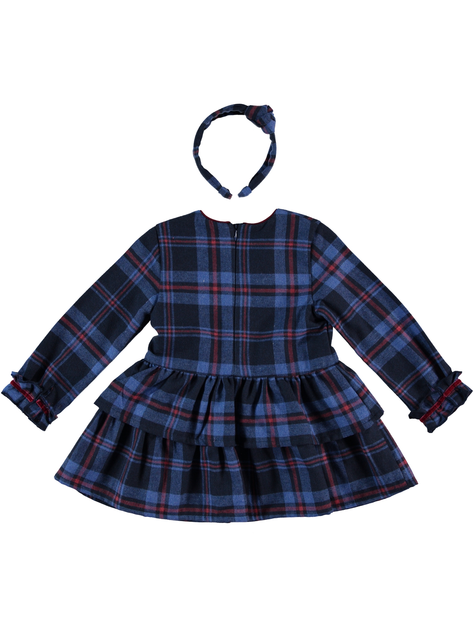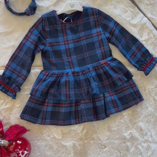 Classic tartan with a twirl! This navy-and-wine check dress features a tiered ruffle skirt, sweet sleeve frills, and contrast piping for a polished holiday look. Finished with a matching braided headband for an easy, picture-perfect outfit.