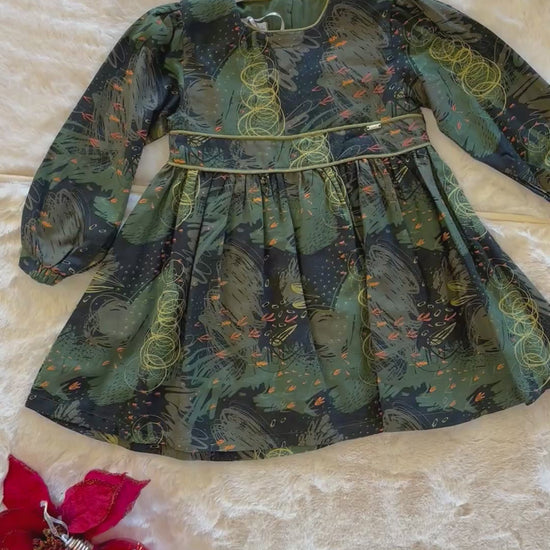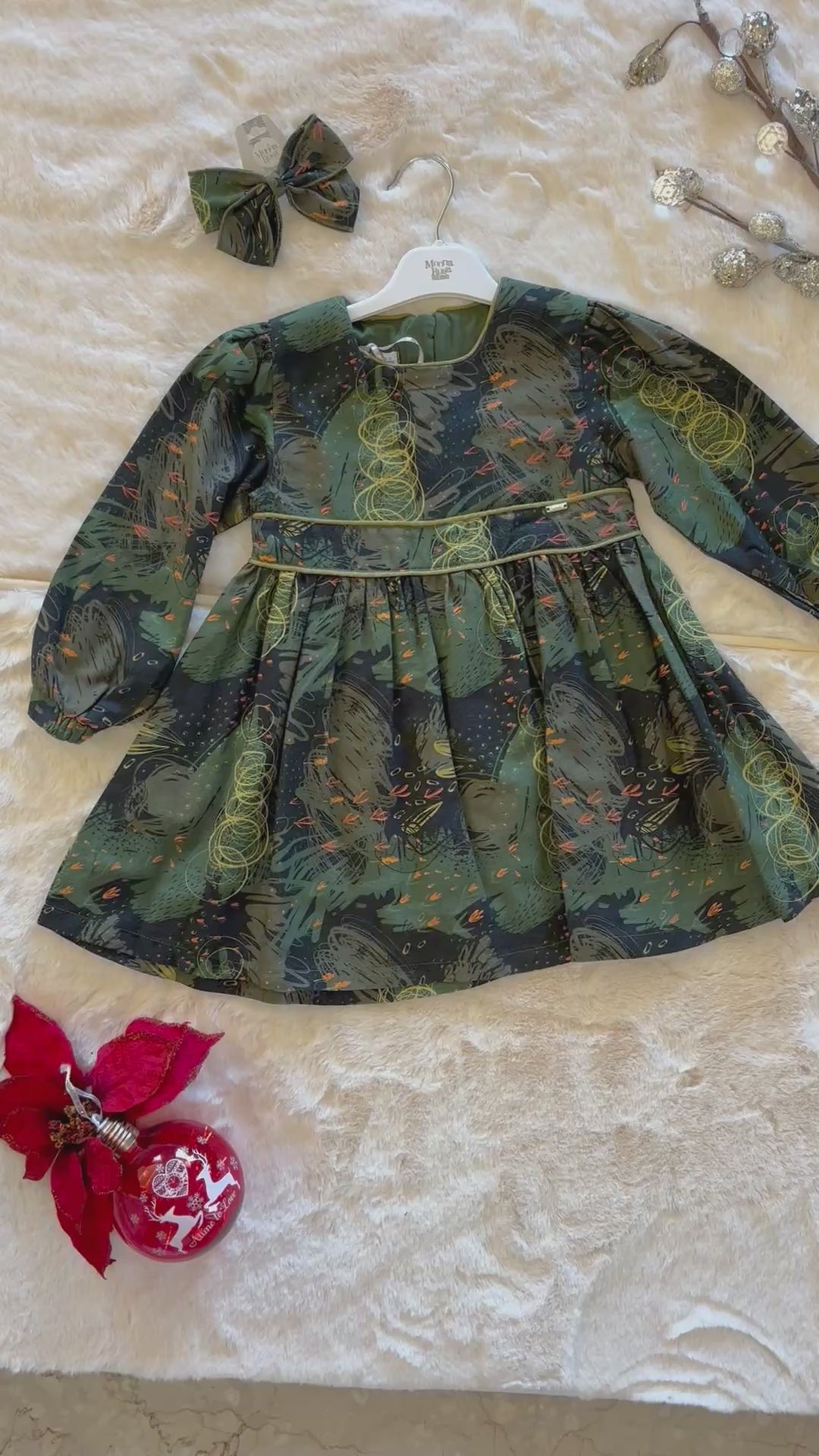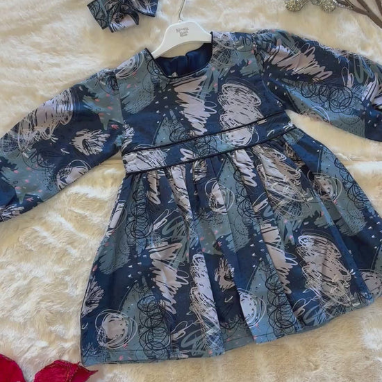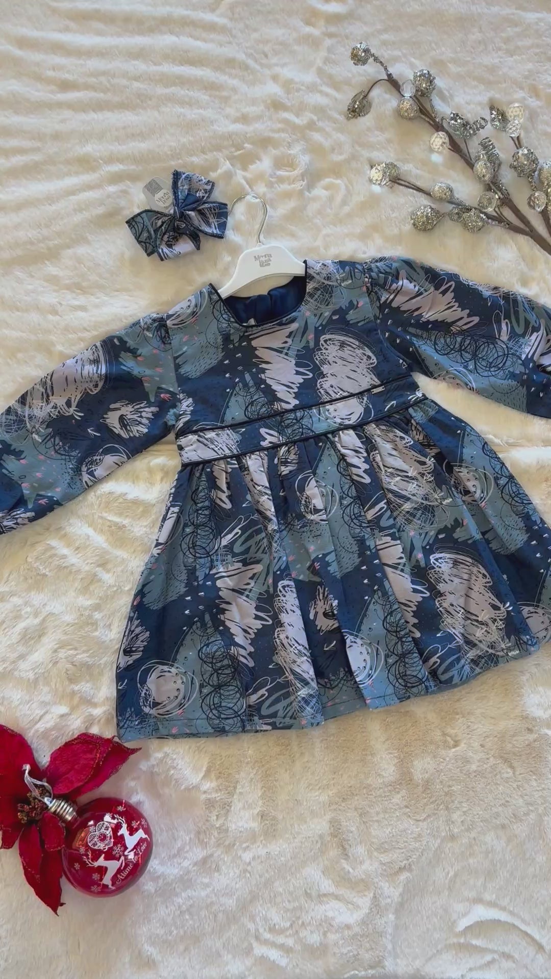 Playful print, classic silhouette. This long-sleeve party dress features an artsy winter motif, a gently gathered skirt for twirl, and a matching hair bow for an effortlessly polished lookβ€”perfect for photos, birthdays, and holiday gatherings.