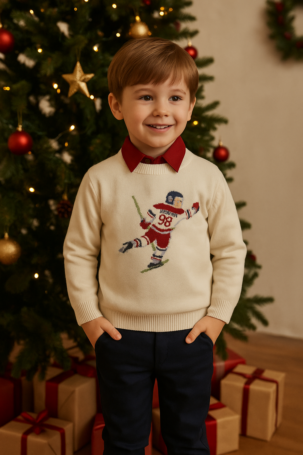Dress him for every festive planβphotos, dinners, and school concerts. This ready-to-wear outfit includes a cozy cream knit with a playful hockey player, a crisp red button-down shirt, and smart navy trousers for a polished finish. Wear the full set for occasion looks or mix and match for everyday style.