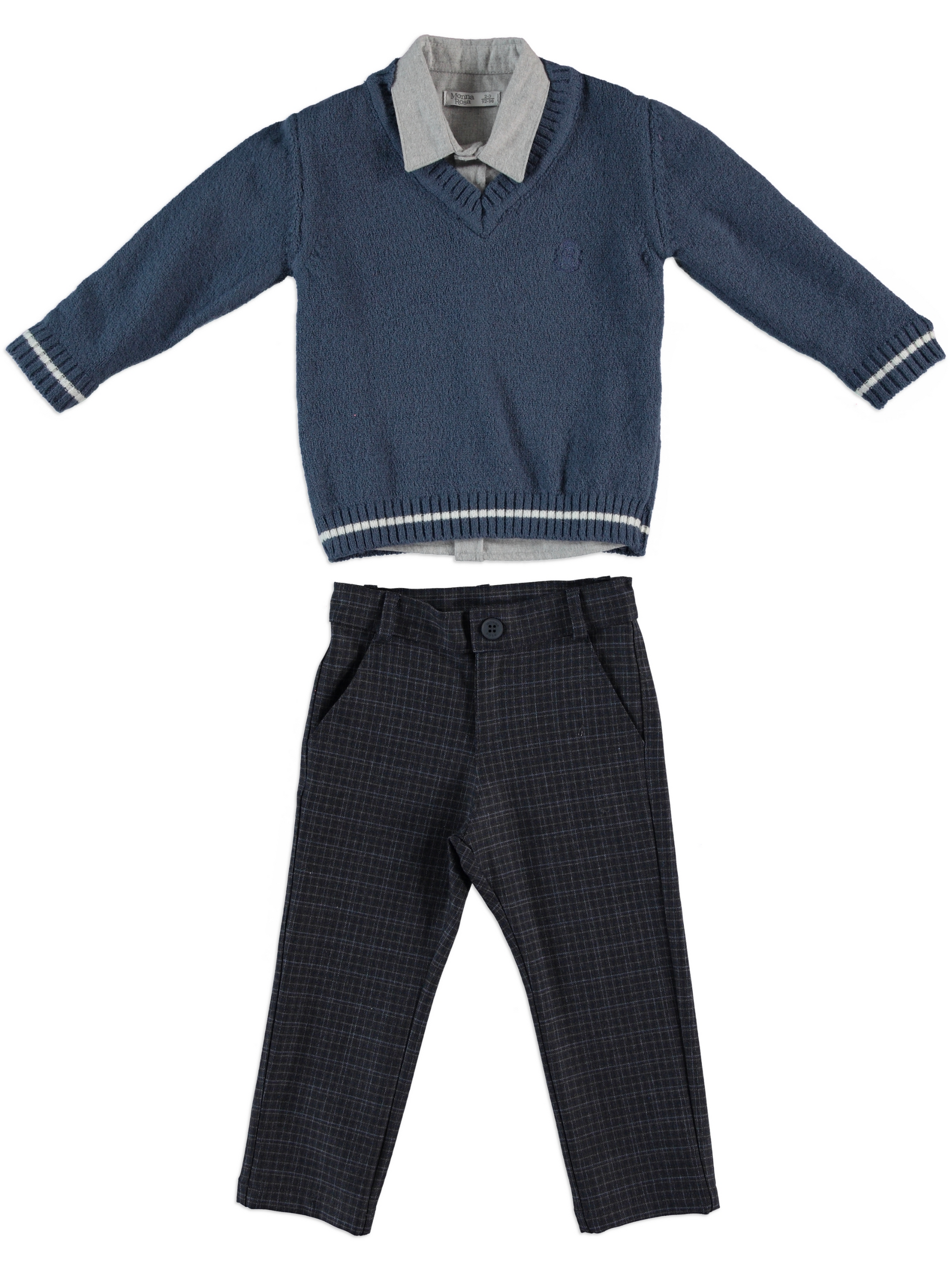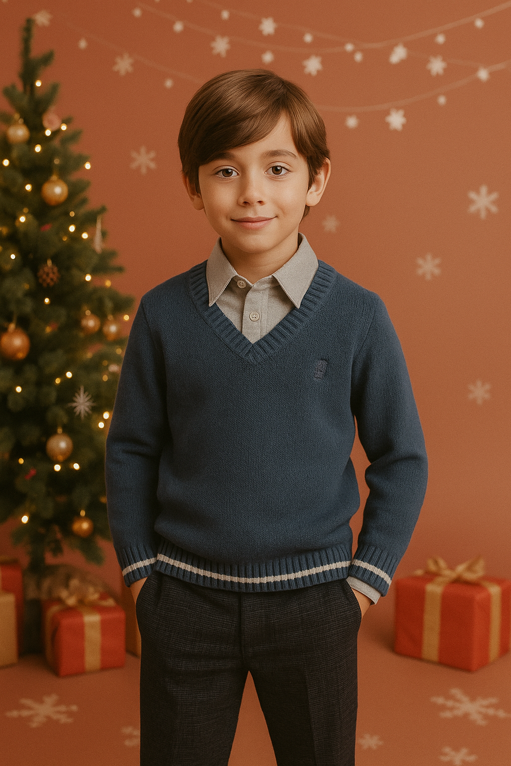 Featuring a soft navy knit sweater with refined ribbed trims and a light grey collared shirt, this layered duo pairs perfectly with charcoal checkered trousers for a smart yet cozy look.