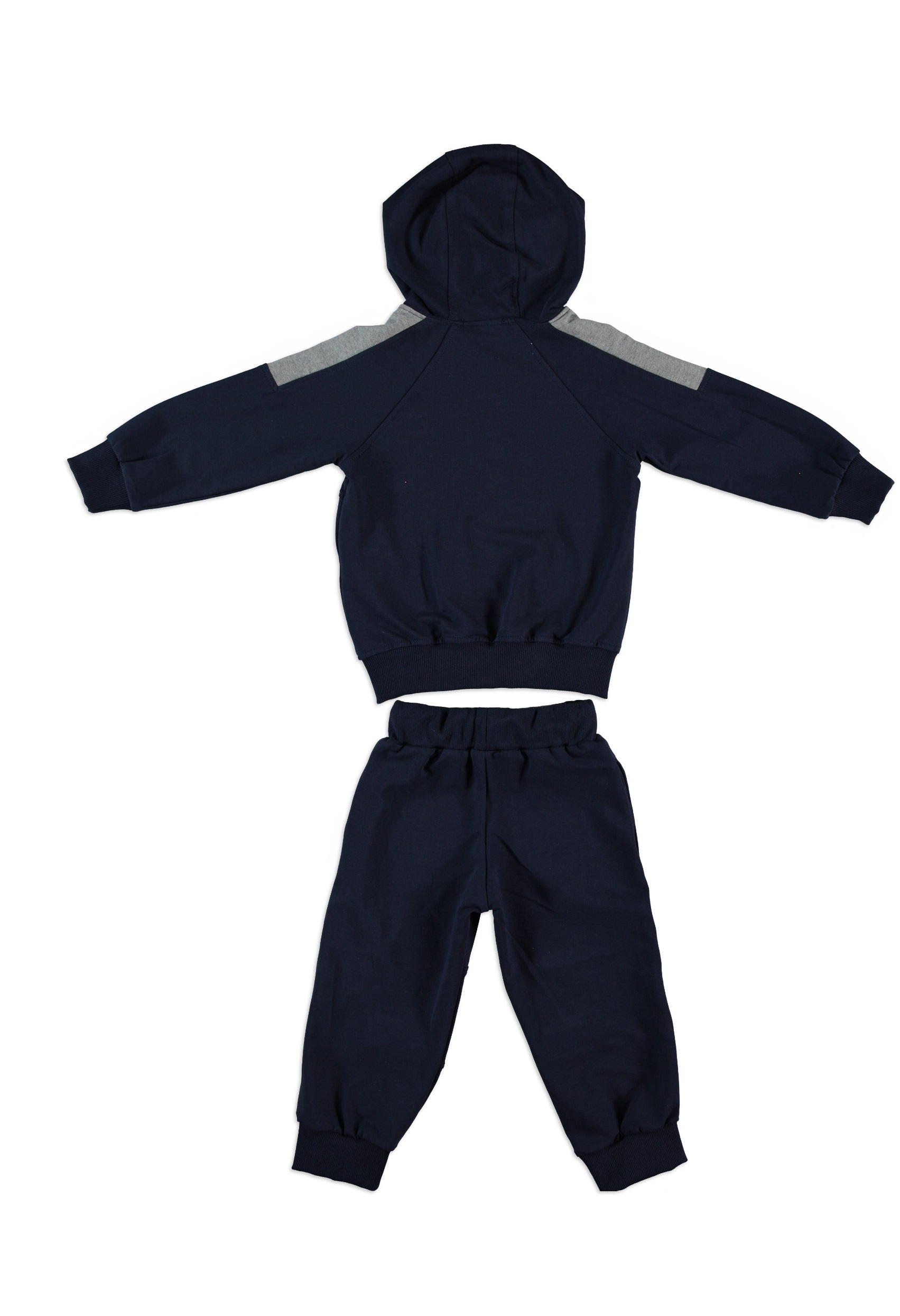 The navy zip-up hoodie with subtle grey shoulder panels pairs effortlessly with matching jogger pants, creating a sleek and modern look that’s perfect for school days, playdates, or weekend adventures.